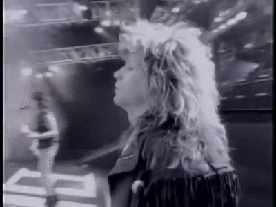 Jon Bon Jovi in 80s big hair glory spinning with a microphone