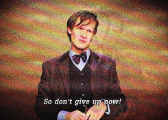 Matt Smith as Doctor Who smiles and raises his arms and starts to speak. The caption reads, "Well, you are doing great!"Matt Smith as Doctor Who holds his fingers up closely together in front of his face and speaks. The caption reads, "You are this close to the finish line."Matt Smith as Doctor Who looks directly at the camera and speaks. The caption says, "So don't give up now!"Matt Smith as Doctor Who raises his arms above his head and appears to be shouting. The caption says, "You can do it!"Matt Smith as Doctor Who points directly at the camera and speaks. The caption says, "And you will be brilliant."